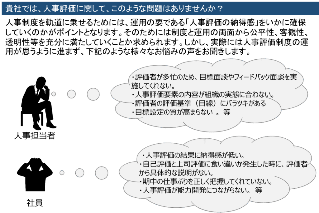 人事制度の運用は人事評価が「要」となります。等級制度(昇進・昇格)や賃金制度(昇給)を運用するために必要となる基礎情報を提供するのは評価制度です。人事評価制度を適切に運用し、定着させることが、人事制度を軌道に乗せる上において大変重要な課題となります。